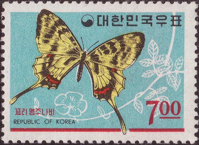 Visibility: public Image owner: none postage 9/15/1966 7w multi issue=wildlife 1966 dt=insects (1966 Korea) d=silkworm unwmk Crops No visible images cropped from this one. Measurements Resolution is unknown. Source Source name: Colnect File URL: http://i.colnect.net/b/2334/496/Butterfly-Sericinus-telamon.jpg Uploaded May 26, 2015, 7:14 pm by Stan Shebs |