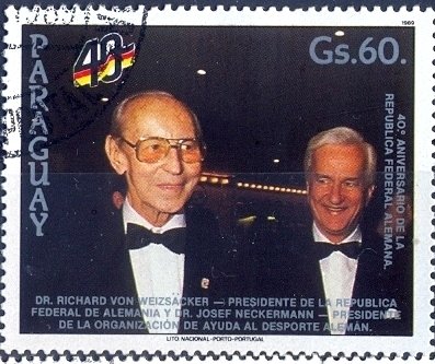 Visibility: public Image owner: none postage 5/27/1989 60g multi issue=40th Anniversary of the Federal Republic of Germany d=Josef Neckermann unwmk perf=13.25x13 Crops No visible images cropped from this one. Measurements Resolution is unknown. Source Source name: Colnect File URL: http://i.colnect.net/b/2329/306/Josef-Neckermann-Richard-von-Weizsäcker.jpg Uploaded June 9, 2015, 10:47 pm by Stan Shebs |