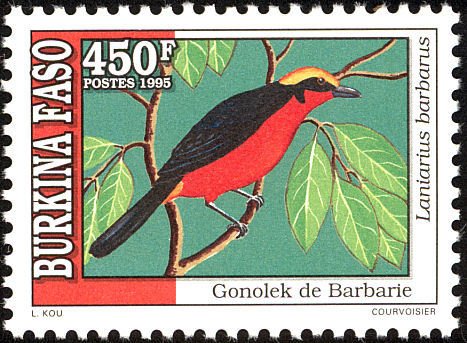 Visibility: public Image owner: none postage 4/5/1995 450fr multi dt=birds (1995 Burkina Faso) d=Laniarius barbarus (1995) unwmk Crops No visible images cropped from this one. Measurements Resolution is unknown. Source Source name: Colnect File URL: http://i.colnect.net/b/2631/940/Yellow-crowned-Gonolek-Laniarius-barbarus.jpg Uploaded June 23, 2015, 4:56 pm by Stan Shebs |