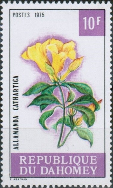 Visibility: public Image owner: none postage 12/8/1975 10fr multi issue=Flowers 1975 dt=flowers (1975 Dahomey) d=Allamanda cathartica (1975 Dahomey) unwmk Crops No visible images cropped from this one. Measurements Resolution is unknown. Source Source name: Colnect File URL: http://i.colnect.net/images/b/2541/446/Allamanda-Cathartica.jpg Uploaded June 27, 2015, 11:14 am by Stan Shebs |