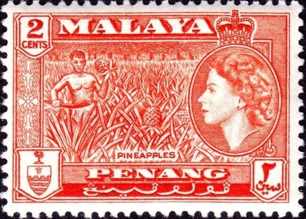 Visibility: public Image owner: none postage 6/26/1957 2c redorg issue=Elizabeth II pictorials d=pineapples & Queen Elizabeth II & arms of Penang Crops No visible images cropped from this one. Measurements Resolution is unknown. Source Source name: Colnect File URL: http://i.colnect.net/b/2591/290/Pineapples.jpg Uploaded June 29, 2015, 11:59 am by Stan Shebs |