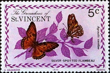 Visibility: public Image owner: none postage 5/15/1975 5c multi dt=butterflies (1975 St. Vincent Grenadines) d=Silver-spotted flambeau wmk=crown & CA spiral Crops No visible images cropped from this one. Measurements Resolution is unknown. Source Source name: Colnect File URL: http://i.colnect.net/b/2549/531/Silver-spotted-Flambeau-Dione-juno.jpg Uploaded July 14, 2015, 4:01 pm by Stan Shebs |