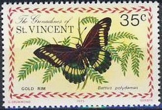 Visibility: public Image owner: none postage 5/15/1975 35c multi dt=butterflies (1975 St. Vincent Grenadines) d=Gold Rim Battus polydamas wmk=crown & CA spiral Crops No visible images cropped from this one. Measurements Resolution is unknown. Source Source name: Colnect File URL: http://i.colnect.net/b/2549/532/Gold-Rim-Swallowtail-Battus-polydamas.jpg Uploaded July 14, 2015, 4:01 pm by Stan Shebs |