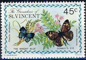 Visibility: public Image owner: none postage 5/15/1975 45c multi dt=butterflies (1975 St. Vincent Grenadines) d=Bright blue Dockeys eye wmk=crown & CA spiral Crops No visible images cropped from this one. Measurements Resolution is unknown. Source Source name: Colnect File URL: http://i.colnect.net/b/2549/533/Bright-Blue-Thecla-dindymus-Westindian-Buckeye-Junionia-.jpg Uploaded July 14, 2015, 4:01 pm by Stan Shebs |