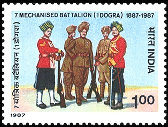 Visibility: public Image owner: none postage 6/3/1987 1r multi issue=100th Anniversary of the 37th Dogra Regiment wmk=Asokan capital Crops No visible images cropped from this one. Measurements Resolution is unknown. Source Source name: Colnect File URL: http://i.colnect.net/b/2525/684/7-Mechanised-Battalion-1-Dogra.jpg Uploaded July 14, 2015, 11:10 pm by Stan Shebs |