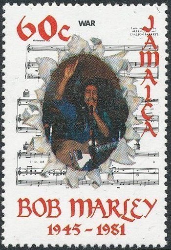 Visibility: public Image owner: none postage 11/20/1981 60c multi issue=Bob Marley memorial d=Portrait of Bob Marley & song title War wmk=Multiple "J" & Pineapple perf=15 Crops No visible images cropped from this one. Measurements Resolution is unknown. Source Source name: Colnect File URL: http://i.colnect.net/b/2467/046/Portrait-of-Bob-Marley-and-song-title--War-.jpg Uploaded July 15, 2015, 7:57 pm by Stan Shebs |