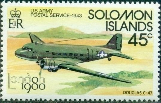 Visibility: public Image owner: none postage 5/6/1980 45c multi issue=London 80 d=Douglas C-47 over Solomons wmk=mult crown & script CA perf=14.5 Crops No visible images cropped from this one. Measurements Resolution is unknown. Source Source name: Colnect File URL: http://i.colnect.net/images/b/2547/523/Douglas-C-4.jpg Uploaded July 22, 2015, 10:13 pm by Stan Shebs |