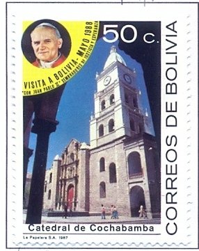 Visibility: public Image owner: none postage 3/3/1988 50c multi issue=Visit of Pope John Paul II unwmk Crops No visible images cropped from this one. Measurements Resolution is unknown. Source Source name: Colnect File URL: http://i.colnect.net/b/2446/936/Cathedral-in-Cochabamba.jpg Uploaded July 28, 2015, 3:09 pm by Stan Shebs |