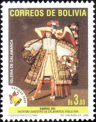 Visibility: public Image owner: none postage 11/11/2000 3b multi issue=Christmas 2000 dt=17th-century paintings of Angels from Calamarca Church unwmk Crops No visible images cropped from this one. Measurements Resolution is unknown. Source Source name: Colnect File URL: http://i.colnect.net/b/2406/043/Gabriel-Dei--Painting-of-the--quot-Master-of-Calamarca-quot-.jpg Uploaded July 28, 2015, 3:18 pm by Stan Shebs |