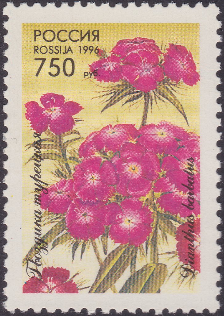 Visibility: public Image owner: none postage 2/22/1996 750r multi dt=flowers (1996 Russia) d=Dianthus barbatus (1996) unwmk Crops No visible images cropped from this one. Measurements Resolution is unknown. Source Source name: Colnect File URL: http://i.colnect.net/b/1830/108/Sweet-williams-Dianthus-barbatus.jpg Uploaded August 12, 2015, 3:57 pm by Stan Shebs |