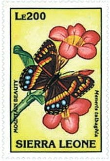 Visibility: public Image owner: none postage 5/5/1993 200le multi issue=Butterflies 1993 dt=butterflies (1993 Sierra Leone) d=Meneris tulbaghia (1993) unwmk perf=14 Crops No visible images cropped from this one. Measurements Resolution is unknown. Source Source name: Colnect File URL: http://i.colnect.net/images/b/2556/416/Mountain-Beauty-Meneris-tulbaghia.jpg Uploaded August 17, 2015, 4:08 pm by Stan Shebs |