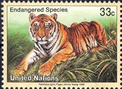 Visibility: public Image owner: none postage 4/22/1999 33c multi issue=Endangered Species 1999 dt=endangered species (1999 United Nations) d=Panthera tigris (1999) unwmk Crops No visible images cropped from this one. Measurements Resolution is unknown. Source Source name: Colnect File URL: http://i.colnect.net/b/2521/459/Tiger-Panthera-tigris.jpg Uploaded August 22, 2015, 11:24 am by Stan Shebs |