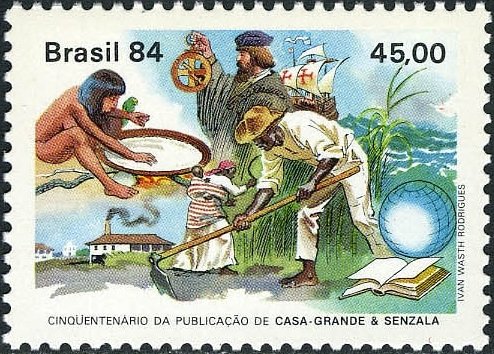Visibility: public Image owner: none postage 1/20/1984 45.00cr multi issue=50th Anniversary of the Publication of "Masters and Slaves" by Gilberto Freyre unwmk perf=11.75 Crops No visible images cropped from this one. Measurements Resolution is unknown. Source Source name: Colnect File URL: http://i.colnect.net/images/b/2262/502/50-years-Book-Casa-Grande-e-Senzala.jpg Uploaded September 5, 2015, 12:10 am by Stan Shebs |