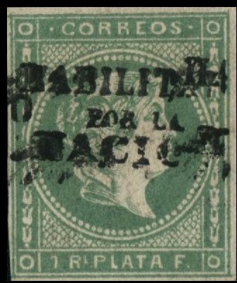 Visibility: public Image owner: none Current identification: postage 1871 1r grn issue=1868 d=Queen Isabella II (1863) ovpt=HABILITADO//POR LA//NACION oc=blk on=1r-grn unwmk imperf Crops No visible images cropped from this one. Measurements Resolution is unknown. Source Source name: Colnect File URL: http://i.colnect.net/b/2826/929/Queen-Isabella-II-handstamped-Habilitado-por-la-NACION.jpg Uploaded September 20, 2015, 4:53 pm by Stan Shebs |