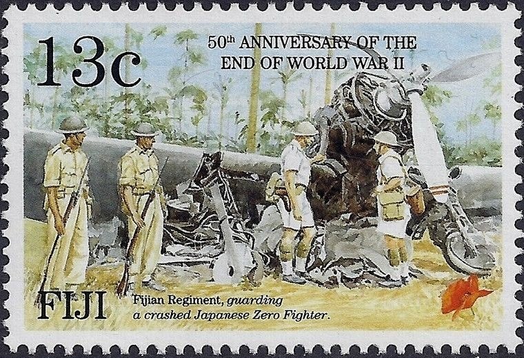 Visibility: public Image owner: none postage 5/8/1995 13c multi issue=50th Anniversary of the End of the Second World War d=Fijian Regiment, guarding a crashed Japanese Zero fighter wmk=mult crown & script CA perf=13.25x13.5 Crops No visible images cropped from this one. Measurements Resolution is unknown. Source Source name: Colnect File URL: http://i.colnect.net/images/b/2635/903/Fijian-Regiment.jpg Uploaded September 29, 2015, 8:29 pm by Stan Shebs |