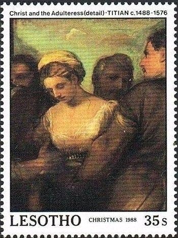 Visibility: public Image owner: none postage 12/1/1988 35s multi issue=Christmas 1988 d=Christ & the Adulteress Adulteress by Titian wmk=basuto hat Crops No visible images cropped from this one. Measurements Resolution is unknown. Source Source name: Colnect File URL: http://i.colnect.net/b/2865/426/Christ-and-the-Adulteress-Adulteress-by-Titian.jpg Uploaded October 5, 2015, 4:53 pm by Stan Shebs |