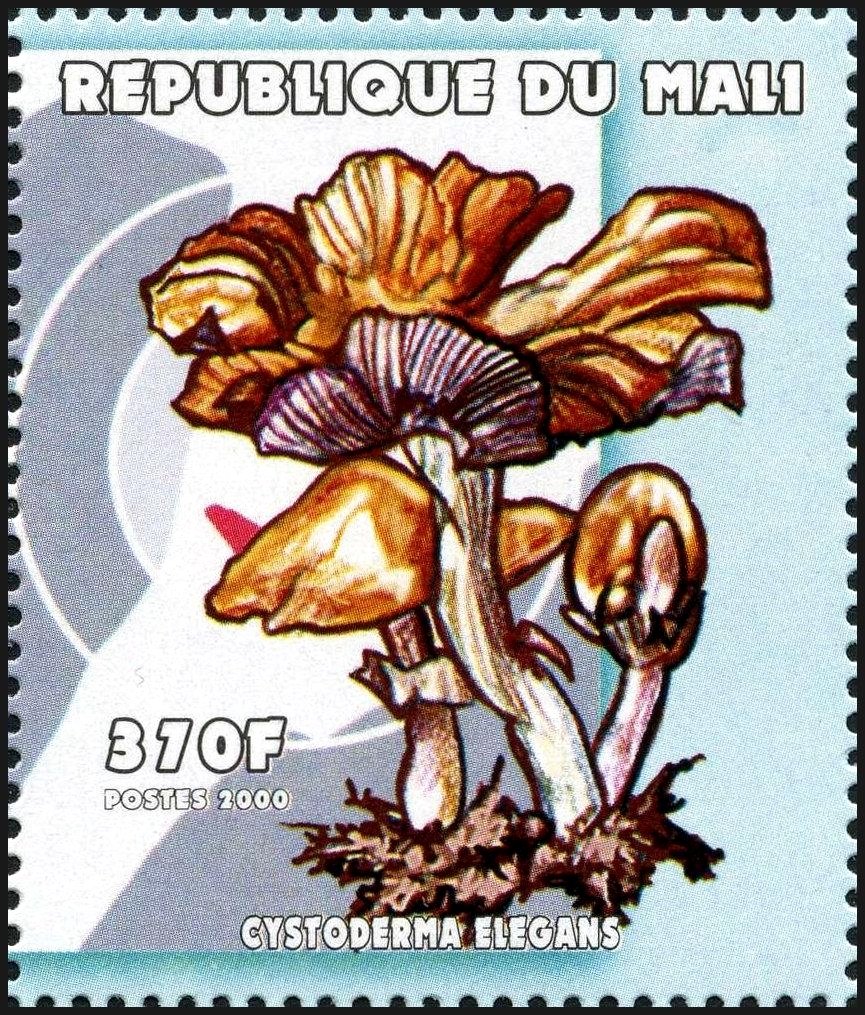 Visibility: public Image owner: none postage 9/25/2000 370fr multi issue=Fungi of the World dt=Fungi of the World d=Cystoderma elegans unwmk perf=13.25 Crops No visible images cropped from this one. Measurements Resolution is unknown. Source Source name: Colnect File URL: http://i.colnect.net/b/2606/962/Cystoderma-elegans.jpg Uploaded October 5, 2015, 7:24 pm by Stan Shebs |