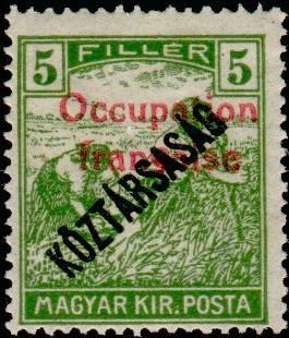 Visibility: public Image owner: none postage 5/5/1919 5f grn issue=1919d Koztarsasag d=harvesting wheat (KIR POSTA) var=colored numerals ovpt=Occupation//francaise oc=red on=issuer=Hungary-issue=1918a-5f wmk=double cross horiz Crops No visible images cropped from this one. Measurements Resolution is unknown. Source Source name: Colnect File URL: http://i.colnect.net/b/817/479/Stamp-of-Hungary-1919.jpg Uploaded August 23, 2014, 5:03 pm by Stan Shebs |