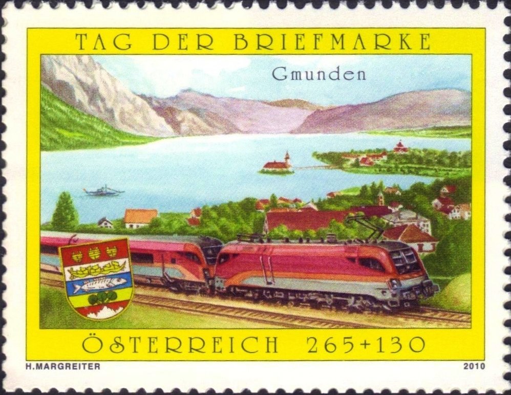 Visibility: public Image owner: none semipostal 8/27/2010 265+130(c) multi issue=Stamp Day 2010 d=Austrian Railways Railjet at Gmunden unwmk perf=14 Crops No visible images cropped from this one. Measurements Resolution is unknown. Source Source name: Colnect File URL: http://i.colnect.net/b/2398/636/Stamp-Day-2010.jpg Uploaded October 15, 2015, 12:50 am by Stan Shebs |