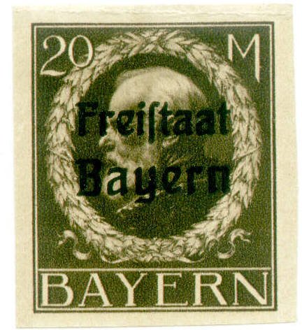 Visibility: public Image owner: none postage 8/6/1919 20m brn issue=1919e d=King Ludwig III (wreath) ovpt=Freistaat//Bayern(roman) oc=blk on=1916-20m-brn-imperf wmk=horiz wavy lines close imperf Crops No visible images cropped from this one. Measurements Resolution is unknown. Source Source name: Colnect File URL: http://i.colnect.net/b/1852/148/Freistaat-on-Ludwig-III.jpg Uploaded October 22, 2015, 1:52 am by Stan Shebs |