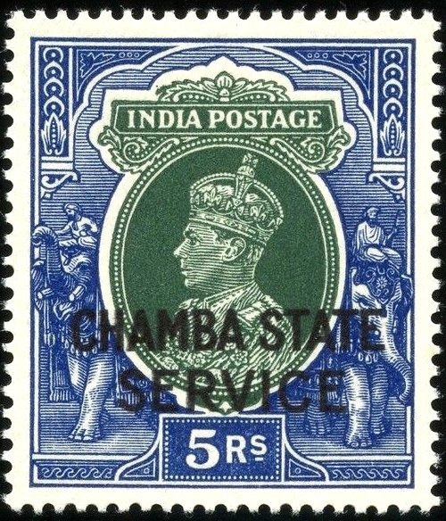 Visibility: public Image owner: none Current identification: official 1940 5r ultra&dkgrn issue=1938 official d=King George VI & elephants ovpt=CHAMBA STATE//SERVICE oc=blk on=issuer=India-1937-5r wmk=mult stars Crops No visible images cropped from this one. Measurements Resolution is unknown. Source Source name: Colnect File URL: http://i.colnect.net/b/2401/007/King-George-VI.jpg Uploaded October 28, 2015, 4:57 am by Stan Shebs |