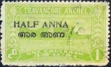 Visibility: public Image owner: none postage 7/1/1949 1/2a yelgrn d=Ashtamudi Lake oc=blk on=issuer=Travancore-1939-1ch wmk=shell Crops No visible images cropped from this one. Measurements Resolution is unknown. Source Source name: Colnect File URL: http://i.colnect.net/b/2646/194/Travancore-Overprint.jpg Uploaded October 28, 2015, 5:48 am by Stan Shebs |