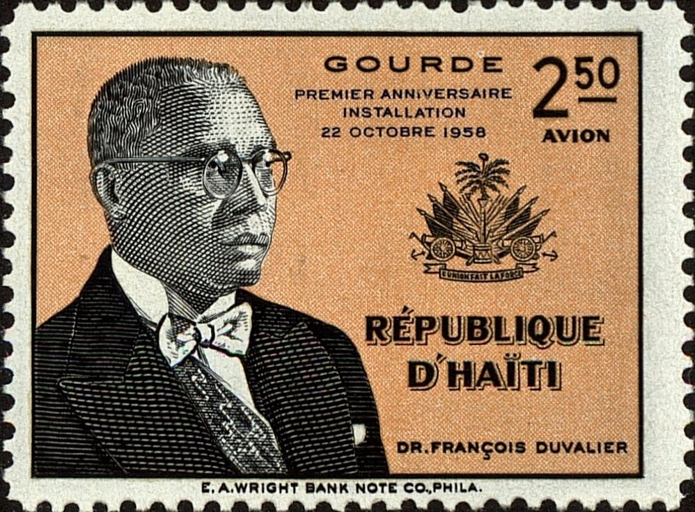 Visibility: public Image owner: none postage 10/22/1958 2.50g ltbrn&blk issue=1st Anniversary of Installation of President Francois Duvalier unwmk Crops No visible images cropped from this one. Measurements Resolution is unknown. Source Source name: Colnect File URL: http://i.colnect.net/b/2802/788/President-Francois-Duvalier-Premier-Anniversaire.jpg Uploaded November 12, 2015, 6:51 pm by Stan Shebs |