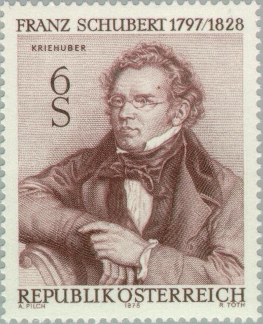 Visibility: public Image owner: none postage 11/17/1978 6s dkredbrn issue=Schubert death 150th d=Franz Schubert 1978 unwmk perf=14.25x14 Crops No visible images cropped from this one. Measurements Resolution is unknown. Source Source name: Colnect File URL: http://i.colnect.net/images/b/137/023/Franz-Schubert-1797-1828-composer.jpg Uploaded November 8, 2012, 7:36 pm by Stan Shebs |