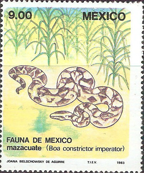 Visibility: public Image owner: none postage 9/23/1983 9.00p multi dt=Mexican Flora and Fauna (1983) d=Boa constrictor wmk=MEX & eagle perf=14x14.5 Crops No visible images cropped from this one. Measurements Resolution is unknown. Source Source name: Colnect File URL: http://i.colnect.net/b/2927/887/Common-Northern-Boa-Boa-constrictor-imperator.jpg Uploaded November 16, 2015, 1:24 am by Stan Shebs |