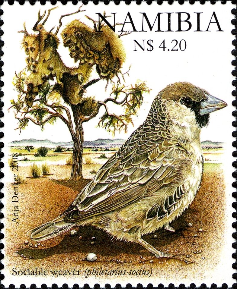 Visibility: public Image owner: none postage 2/28/2008 $4.20 multi dt=weaver birds of Namibia d=Sociable weaver unwmk Crops No visible images cropped from this one. Measurements Resolution is unknown. Source Source name: Colnect File URL: http://i.colnect.net/images/b/2769/587/Social-Weaver-Philetarius-socius.jpg Uploaded November 16, 2015, 5:39 pm by Stan Shebs |