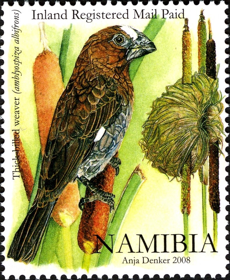 Visibility: public Image owner: none postage 2/28/2008 Inland Registered Mail Paid multi dt=weaver birds of Namibia d=Thick billed weaver unwmk Crops No visible images cropped from this one. Measurements Resolution is unknown. Source Source name: Colnect File URL: http://i.colnect.net/images/b/2769/588/Thick-billed-Weaver-Amblyospiza-albifrons.jpg Uploaded November 16, 2015, 5:39 pm by Stan Shebs |