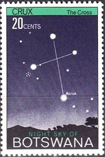 Visibility: public Image owner: none postage 4/24/1972 20c multi issue=Night Sky of Botswana dt=constellations d=Southern Cross over Botswana unwmk Crops No visible images cropped from this one. Measurements Resolution is unknown. Source Source name: Colnect File URL: http://i.colnect.net/b/1904/733/Southern-Cross.jpg Uploaded November 22, 2015, 9:27 pm by Stan Shebs |