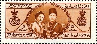 Visibility: public Image owner: none postage 1/20/1938 5m redbrn issue=Farouk & Farida wedding d=Farouk & Farida wmk=triple crescent & star perf=11x11.5 Crops No visible images cropped from this one. Measurements Resolution is unknown. Source Source name: Colnect File URL: http://i.colnect.net/b/1281/944/Royal-Wedding---King-Farouk-and-Queen-Farida.jpg Uploaded August 24, 2014, 1:51 pm by Stan Shebs |
