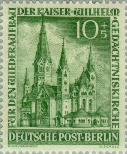 Visibility: public Image owner: none semipostal 8/9/1953 10+5pf grn issue=Reconstruction of the Kaiser Wilhelm Memorial Church d=Kaiser Wilhelm Memorial Church Crops No visible images cropped from this one. Measurements Resolution is unknown. Source Source name: Colnect File URL: http://i.colnect.net/images/b/154/832/Before-the-destruction.jpg Uploaded August 24, 2014, 4:32 pm by Stan Shebs |