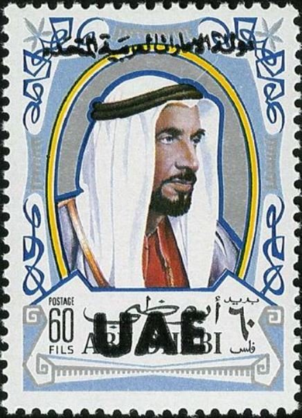 Visibility: public Image owner: none United Arab Emirates postage 8/1972 60f multi issue=Provisional d=Sheik Zayed in oval frame ovpt=UAE oc=blk on=issuer=Abu Dhabi-issue=1970-60f unwmk perf=14 Crops No visible images cropped from this one. Measurements Resolution is unknown. Source Source name: Colnect File URL: http://i.colnect.net/b/2706/334/Sheikh-Zayed-bin-Sultan-Al-Nahyan-optd-UAE-and-Arabic-inscr.jpg Uploaded April 30, 2016, 5:15 pm by Stan Shebs |