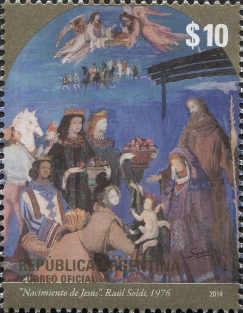 Visibility: public Image owner: none postage 11/21/2014 10.00p multi issue=Christmas 2014 unwmk Crops No visible images cropped from this one. Measurements Resolution is unknown. Source Source name: Colnect File URL: http://i.colnect.net/b/2879/513/-Birth-of-Jesus--by-Raúl-Soldi-1976.jpg Uploaded May 4, 2016, 9:35 pm by Stan Shebs |