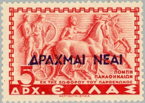 Visibility: public Image owner: none postage 11/11/1944 5d red issue=new currency d=Panathenaic Procession ovpt=DRACHMAI NEAI oc=blk on=1937-5d-red wmk=crowns Crops No visible images cropped from this one. Measurements Resolution is unknown. Source Source name: Colnect File URL: http://i.colnect.net/b/168/178/First-post-WWII-monetary-reform---New-Drachma.jpg Uploaded August 24, 2014, 4:46 pm by Stan Shebs |