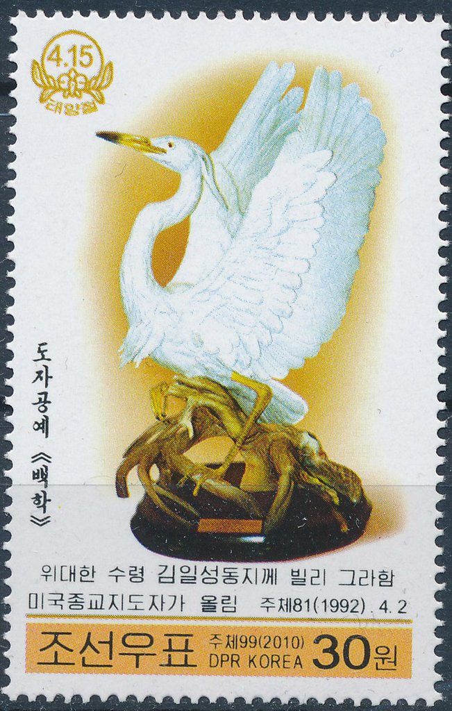 Visibility: public Image owner: none postage 4/15/2010 30w multi issue=98th Anniversary of the Birth of Kim Il Sung d=Ceramic figure of a white crane unwmk perf=13.25 Crops No visible images cropped from this one. Measurements Resolution is unknown. Source Source name: Colnect File URL: http://i.colnect.net/b/3266/377/Ceramic-figure-of-a-white-crane.jpg Uploaded May 13, 2016, 2:29 am by Stan Shebs |