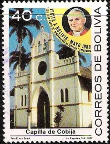 Visibility: public Image owner: none postage 3/3/1988 40c multi issue=Visit of Pope John Paul II unwmk Crops No visible images cropped from this one. Measurements Resolution is unknown. Source Source name: Colnect File URL: http://i.colnect.net/b/3289/835/Chapel-de-Cobija.jpg Uploaded May 16, 2016, 5:11 pm by Stan Shebs |