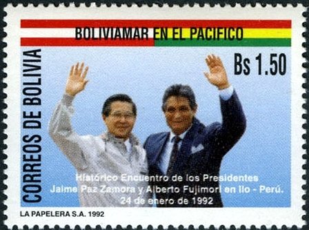 Visibility: public Image owner: none postage 3/23/1992 1.50b multi issue=Creation of Bolivian Free Zone in Ilo, Peru d=Presidents Fujimori, Peru, and Paz Zamora unwmk Crops No visible images cropped from this one. Measurements Resolution is unknown. Source Source name: Colnect File URL: http://i.colnect.net/b/3286/704/President-Fujimori-Peru-and-Paz-Zamora-Bolivia.jpg Uploaded May 16, 2016, 5:25 pm by Stan Shebs |