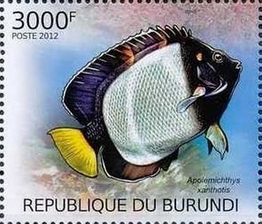 Visibility: public Image owner: none postage 8/31/2012 3000fr multi issue=Protection of Nature - Fish on the Red List unwmk Crops No visible images cropped from this one. Measurements Resolution is unknown. Source Source name: Colnect File URL: http://i.colnect.net/b/3102/366/Indian-Yellowtail-Angelfish-Apolemichthys-xanthurus.jpg Uploaded May 23, 2016, 3:57 pm by Stan Shebs |