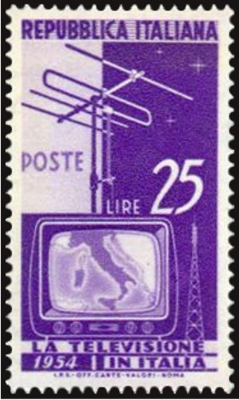 Visibility: public Image owner: none postage 2/25/1954 25l pur issue=television introduction d=television with Map of Italy on screen & aerial wmk=winged wheel Crops No visible images cropped from this one. Measurements Resolution is unknown. Source Source name: Colnect File URL: http://i.colnect.net/b/1297/424/Television-and-radio-antenna.jpg Uploaded August 24, 2014, 5:40 pm by Stan Shebs |