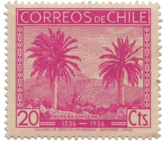 Visibility: public Image owner: none postage 3/1/1936 20c cer issue=Chile discovery 400th d=coquito palms wmk=mult star in shield perf=14 Crops No visible images cropped from this one. Measurements Resolution is unknown. Source Source name: Colnect File URL: http://i.colnect.net/images/b/3058/297/Chilean-Wine-Palm.jpg Uploaded May 27, 2016, 12:53 am by Stan Shebs |