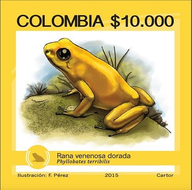 Visibility: public Image owner: none postage 7/6/2015 10000p multi issue=2015 d=Phyllobates terribilis (2015) unwmk Crops No visible images cropped from this one. Measurements Resolution is unknown. Source Source name: Colnect File URL: http://i.colnect.net/images/b/2942/602/Golden-Poison-Frog-Phyllobates-terribilis.jpg Uploaded May 27, 2016, 9:01 pm by Stan Shebs |