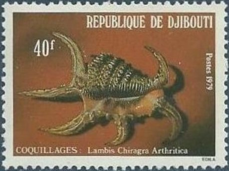 Visibility: public Image owner: none postage 12/22/1979 40fr multi dt=seashells (1979 Djibouti) d=Lambis chiragra arthritica unwmk Crops No visible images cropped from this one. Measurements Resolution is unknown. Source Source name: Colnect File URL: http://i.colnect.net/images/b/2797/564/Arthritic-Spider-Conch-Lambis-chiragra-arthritica-.jpg Uploaded June 3, 2016, 5:04 pm by Stan Shebs |