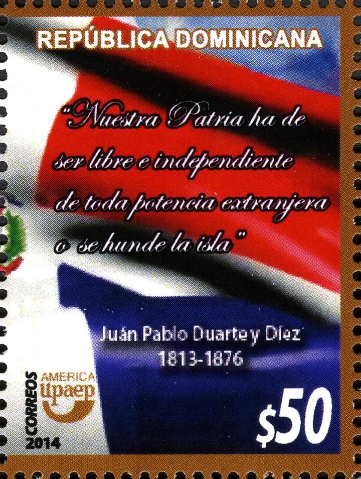 Visibility: public Image owner: none postage 9/30/2014 $50 multi issue=America 2014 b d=Juan Pablo Duarte y Diez wmk=crosses & circles Crops No visible images cropped from this one. Measurements Resolution is unknown. Source Source name: Colnect File URL: http://i.colnect.net/b/3164/493/Flag.jpg Uploaded June 3, 2016, 6:52 pm by Stan Shebs |