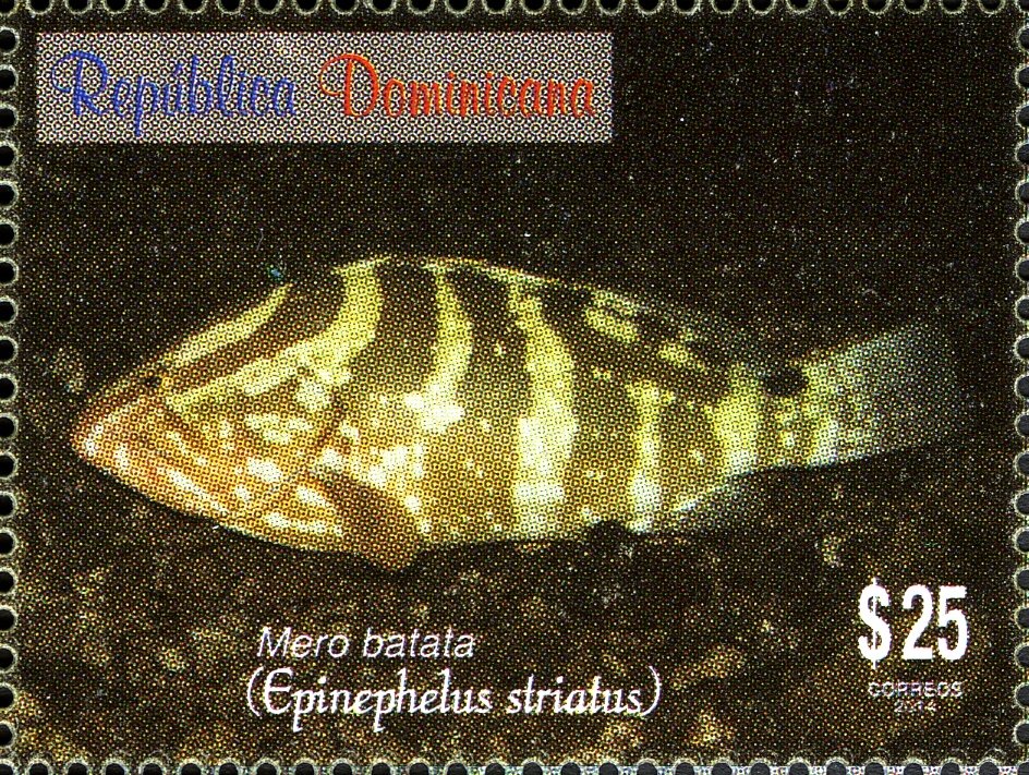 Visibility: public Image owner: none postage 11/20/2014 $25 multi issue=Fauna of Hispaniola d=Epinephelus striatus (2014) wmk=crosses & circles Crops No visible images cropped from this one. Measurements Resolution is unknown. Source Source name: Colnect File URL: http://i.colnect.net/b/3164/517/Nassau-Grouper-Epinephelus-striatus.jpg Uploaded June 3, 2016, 6:53 pm by Stan Shebs |
