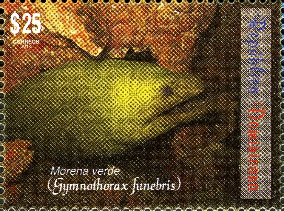 Visibility: public Image owner: none postage 11/20/2014 $25 multi issue=Fauna of Hispaniola d=Gymnothorax funebris (2014) wmk=crosses & circles Crops No visible images cropped from this one. Measurements Resolution is unknown. Source Source name: Colnect File URL: http://i.colnect.net/b/3164/518/Green-Moray-Gymnothorax-funebris.jpg Uploaded June 3, 2016, 6:53 pm by Stan Shebs |