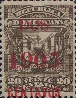 Visibility: public Image owner: none postage 4/4/1905 2c brn d=arms of the Dominican Republic (1885) ovpt=value//1905//CENTAVOS oc=blk on=1885-20c-brn unwmk perf=12 Crops No visible images cropped from this one. Measurements Resolution is unknown. Source Source name: Colnect File URL: http://i.colnect.net/b/3076/751/Coat-of-Arms-Mi-65-overprinted-in-red-2c-on-20c.jpg Uploaded June 3, 2016, 7:13 pm by Stan Shebs |