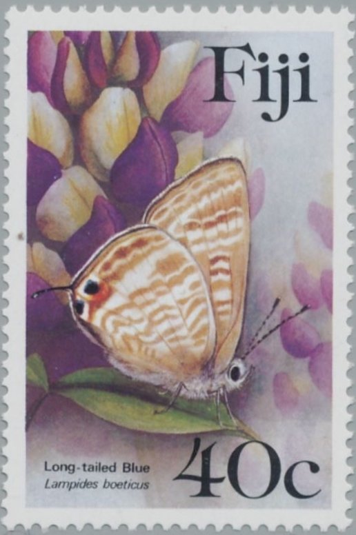 Visibility: public Image owner: none postage 2/4/1985 40c multi dt=butterflies (1985 Fiji) d=Lampides boeticus (1985) wmk=mult crown & script CA Crops No visible images cropped from this one. Measurements Resolution is unknown. Source Source name: Colnect File URL: http://i.colnect.net/images/b/2651/312/Long-tailed-Blue-Lampides-boeticus.jpg Uploaded June 7, 2016, 2:48 pm by Stan Shebs |
